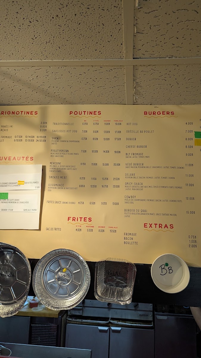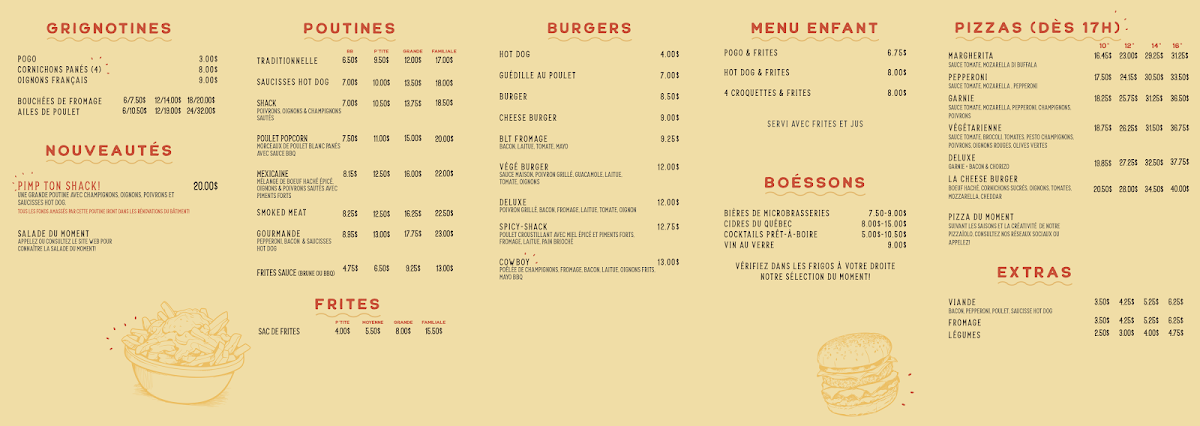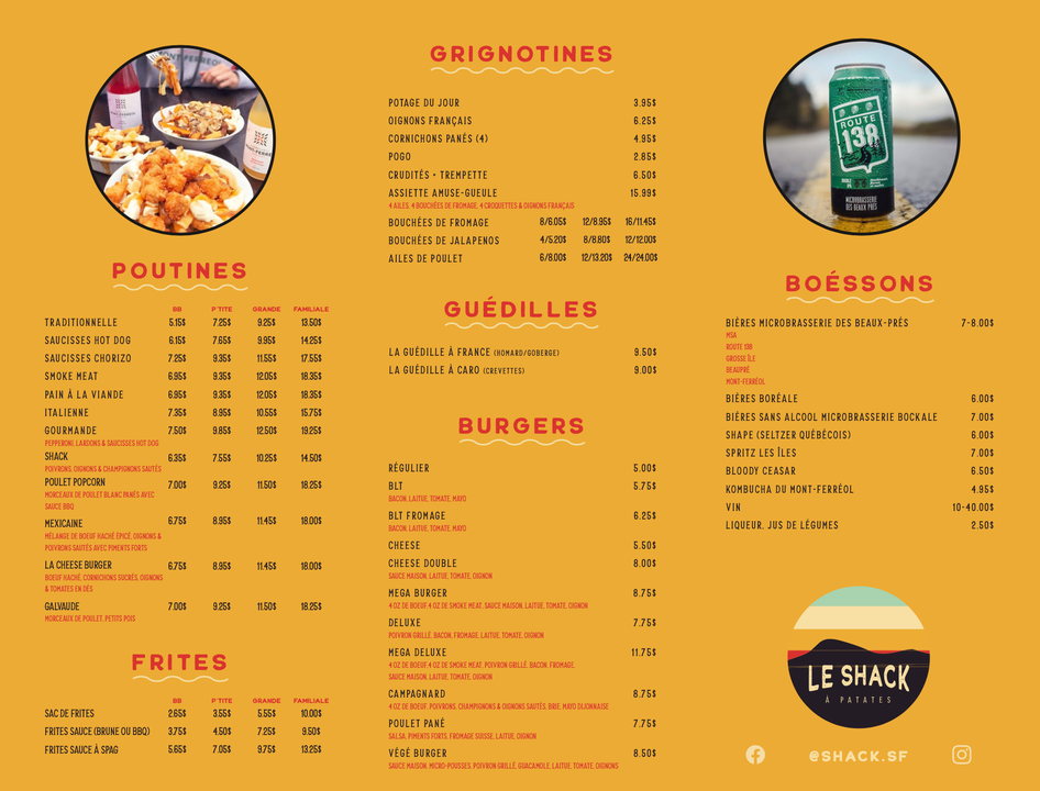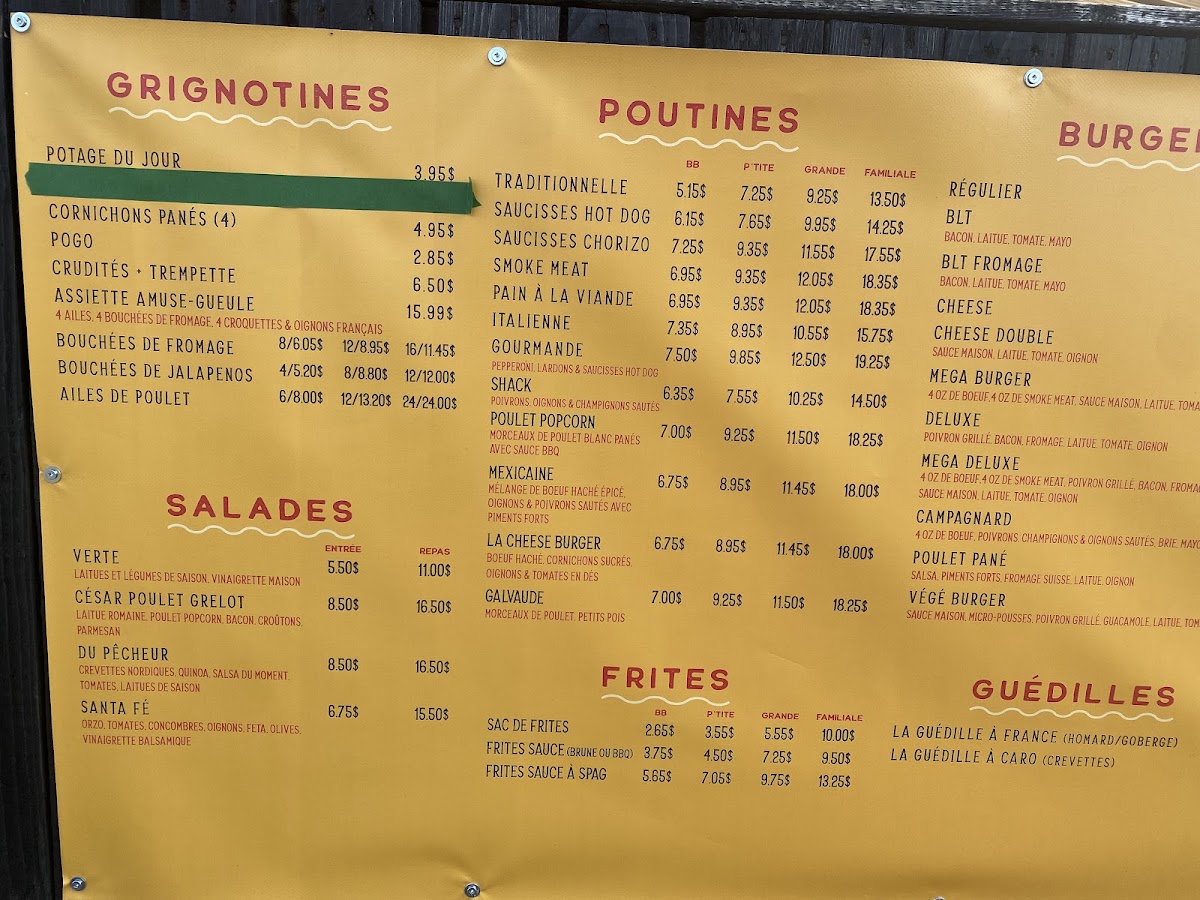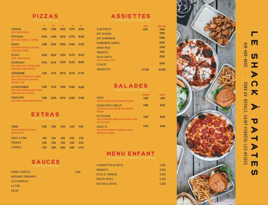 From a reviewer’s perspective, Le Shack À Patates delivers a menu that perfectly blends classic comfort food with playful twists. The grignotines section tempts with POGO, cornichons panés (4), oignons français, bouchées de fromage, and ailes de poulet, making for ideal starters or snackable bites. Their poutines showcase variety, from the traditionnelle to the indulgent saucisses hot dog, Shack, poulet popcorn, and mexicaine, each offering a hearty, satisfying experience. For simpler sides, the sac de frites is a generous option. The burgers range from casual favorites like the hot dog and cheeseburger to the more inventive guédille au poulet and BLT fromage, ensuring choices for all tastes. Young diners are not forgotten, with the menu enfant featuring POGO & frites, hot dog & frites, and 4 croquettes & frites, catering to smaller appetites. Evening pizza lovers can enjoy options starting at 5 PM, including Margherita, Pepperoni, Garnie végétarienne, and Deluxe, rounding out a menu that balances indulgence, variety, and accessibility. Each item feels thoughtfully curated, offering both classic flavors and playful combinations that make dining here a reliably satisfying experience.