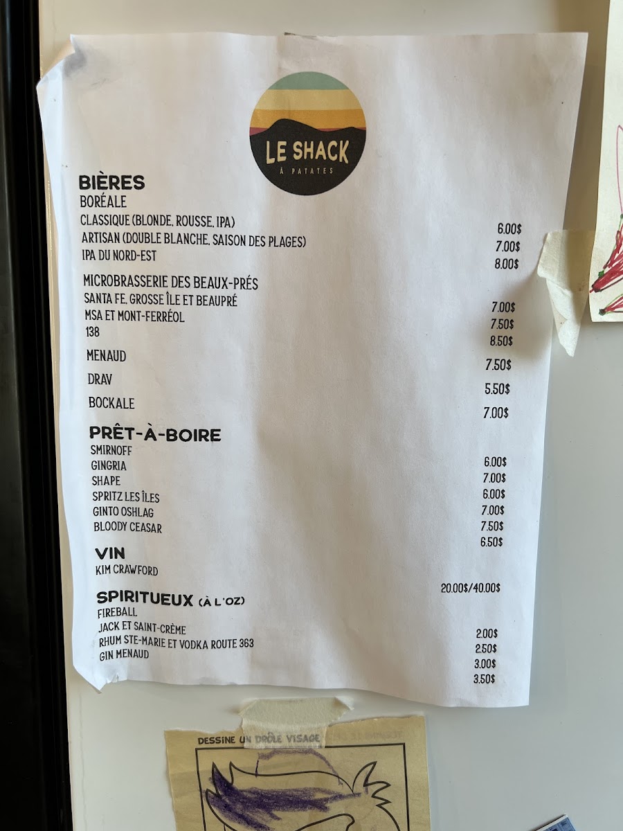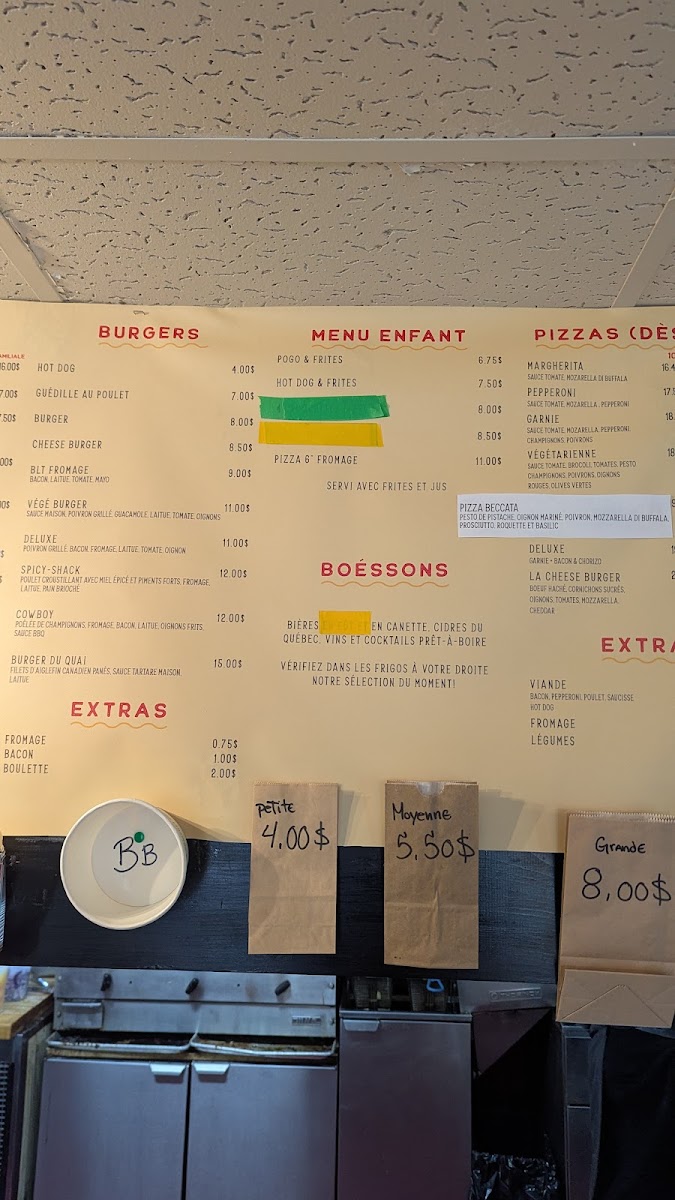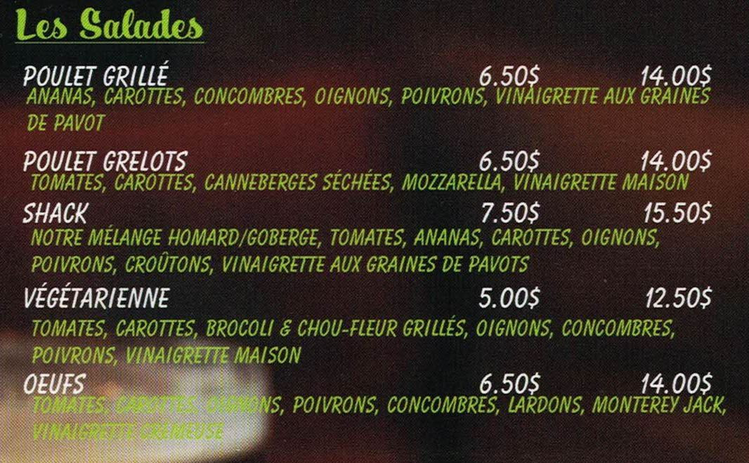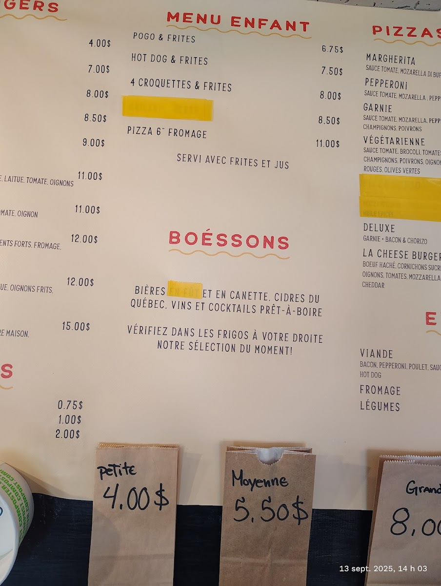 From a reviewer’s perspective, Le Shack À Patates delivers a menu that perfectly blends classic comfort food with playful twists. The grignotines section tempts with POGO, cornichons panés (4), oignons français, bouchées de fromage, and ailes de poulet, making for ideal starters or snackable bites. Their poutines showcase variety, from the traditionnelle to the indulgent saucisses hot dog, Shack, poulet popcorn, and mexicaine, each offering a hearty, satisfying experience. For simpler sides, the sac de frites is a generous option. The burgers range from casual favorites like the hot dog and cheeseburger to the more inventive guédille au poulet and BLT fromage, ensuring choices for all tastes. Young diners are not forgotten, with the menu enfant featuring POGO & frites, hot dog & frites, and 4 croquettes & frites, catering to smaller appetites. Evening pizza lovers can enjoy options starting at 5 PM, including Margherita, Pepperoni, Garnie végétarienne, and Deluxe, rounding out a menu that balances indulgence, variety, and accessibility. Each item feels thoughtfully curated, offering both classic flavors and playful combinations that make dining here a reliably satisfying experience.